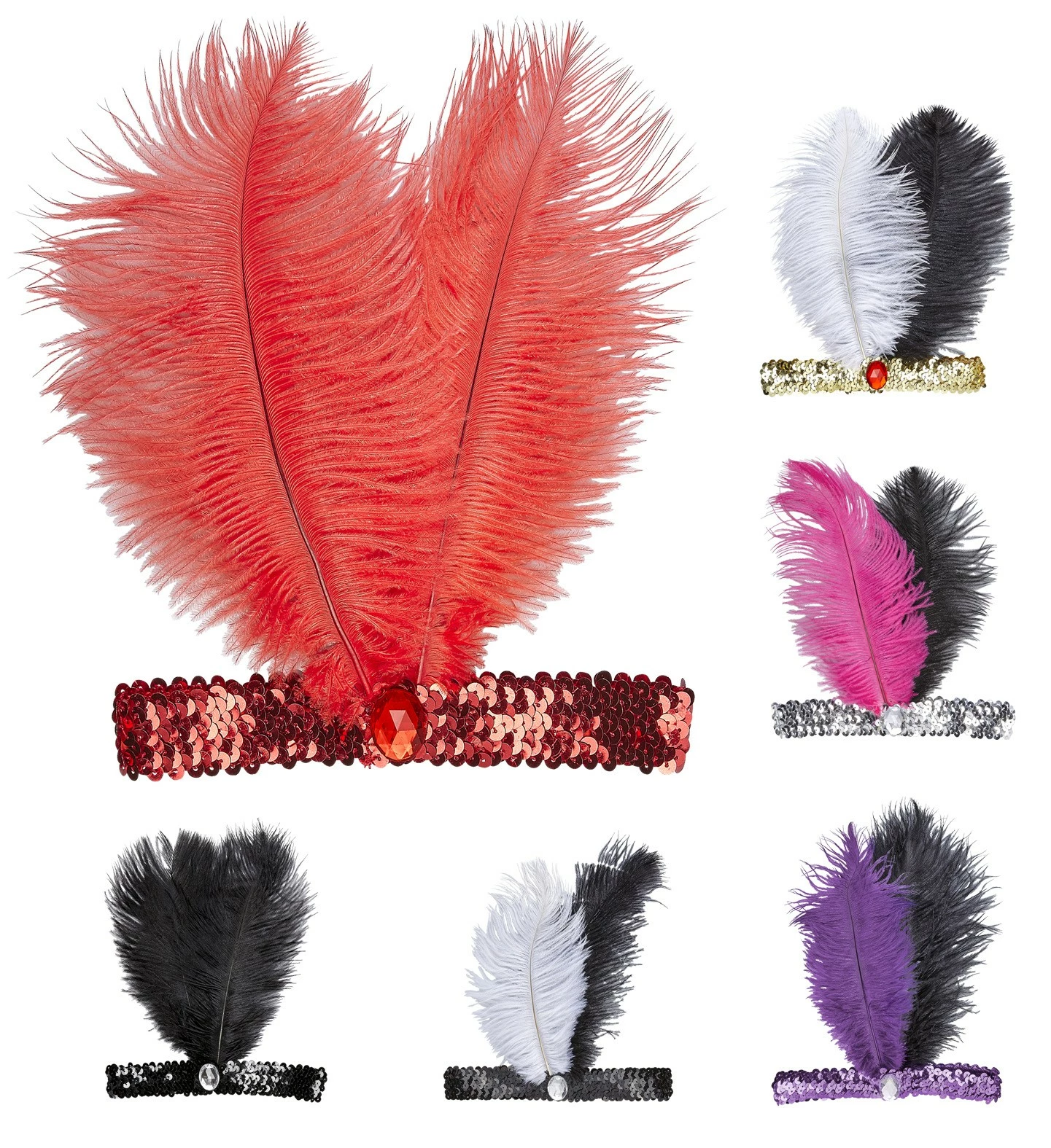 Le bandeau se compose d’un tour de tête en sequin orné de deux grandes plumes et d’un diamant sur le devant. Décliné en plusieurs coloris :