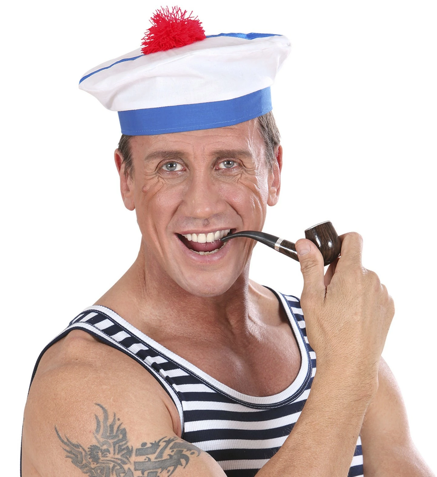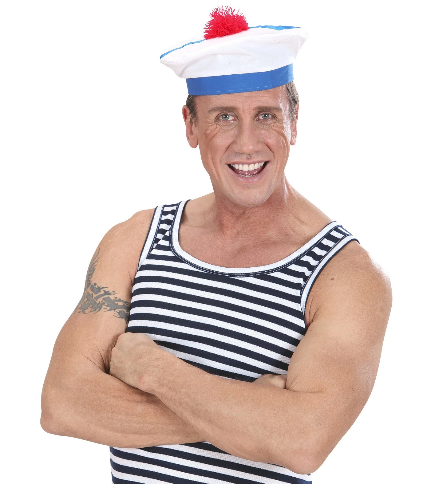 Ce béret est en tissu blanc avec une bande bleue sur le bas ainsi que sur le dessus et est décoré d’un pompon rouge au milieu.