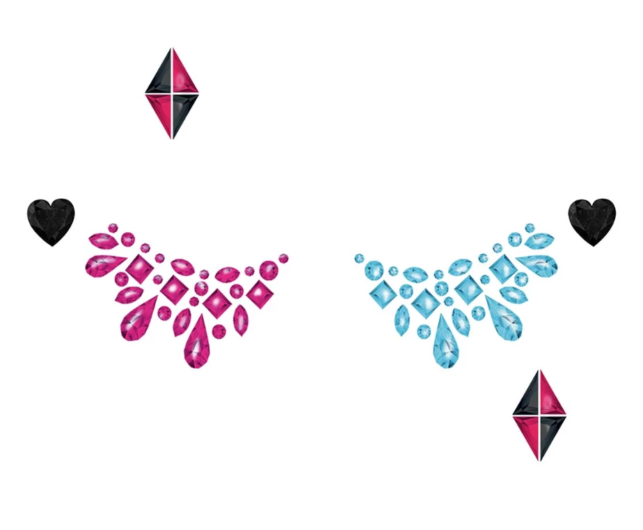 Lot de bijoux adhésifs pour visage de couleur rose et bleu à placer autour des yeux.