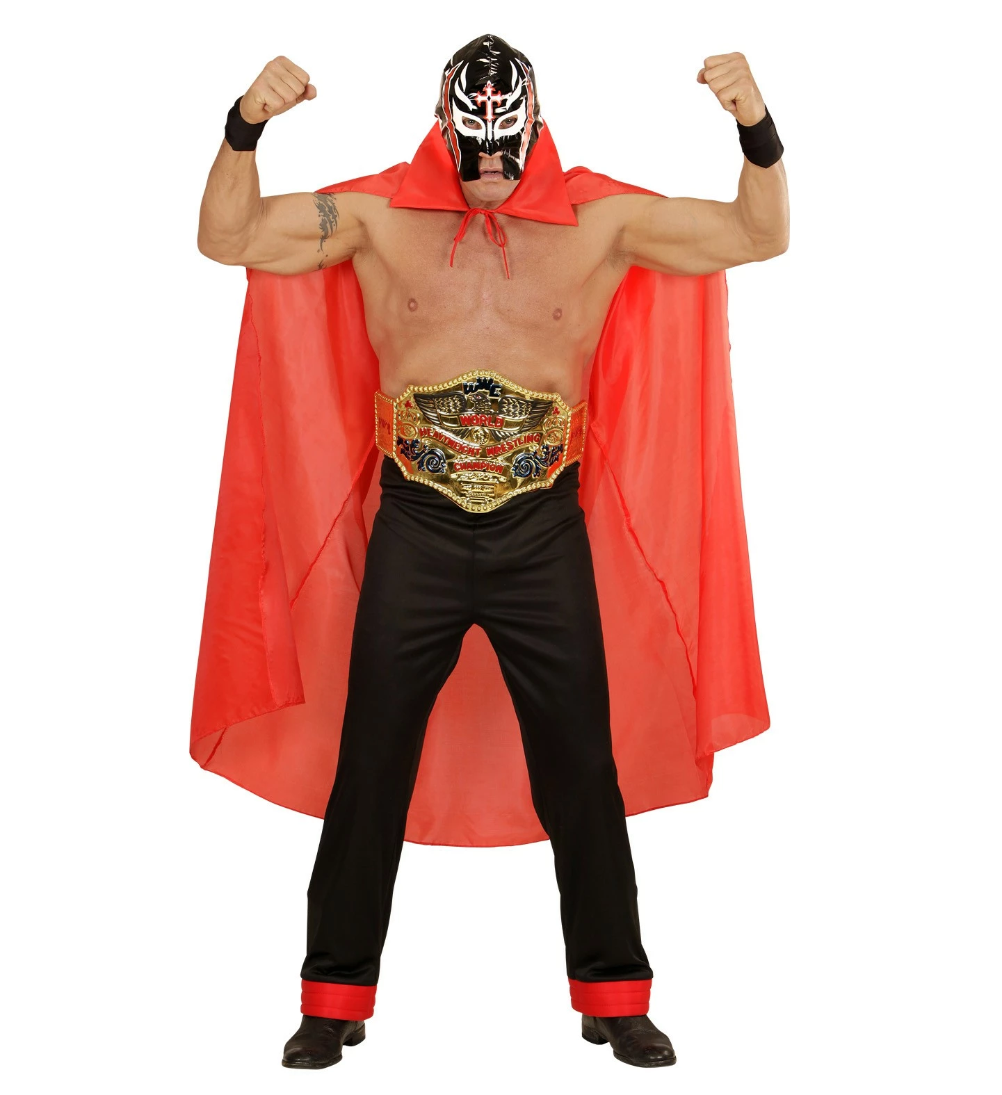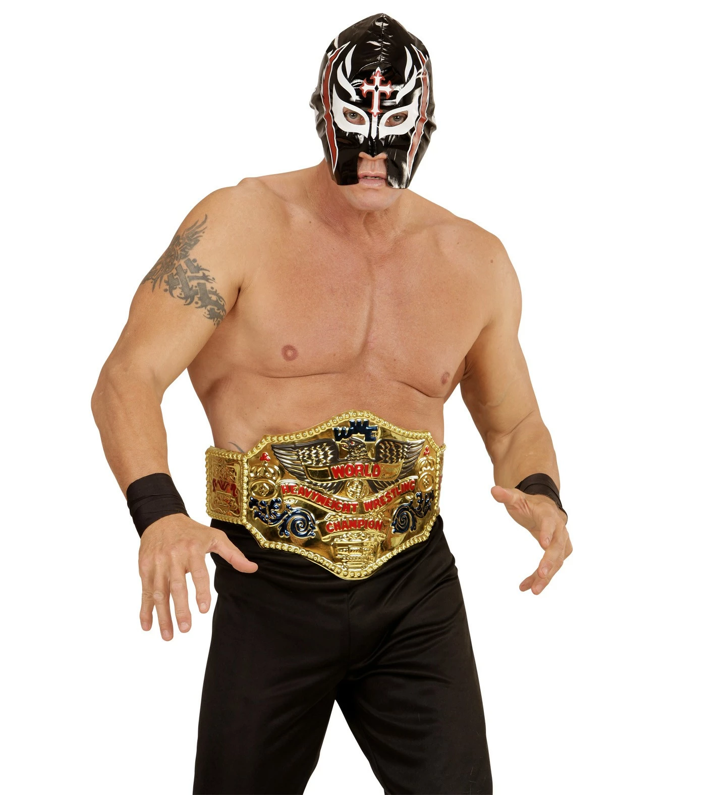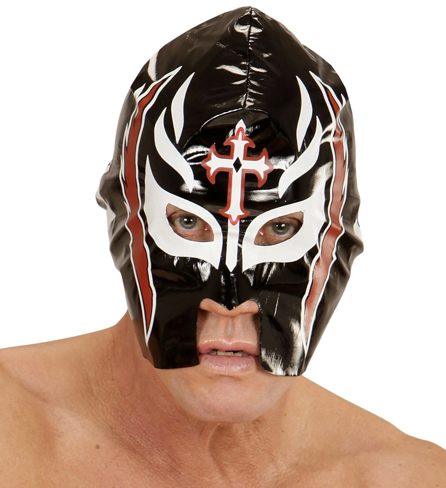 Cette cagoule est en simili cuire noir avec des détails blancs autour des yeux et des flammes sur les côtés.
