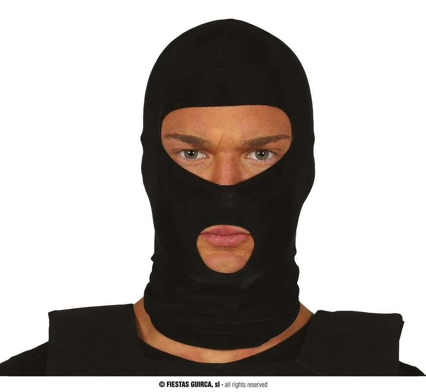 Cagoule noir avec un trou pour les yeux et un pour la bouche.