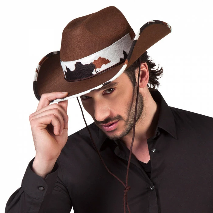Ce chapeau marron avec des motifs vaches sur le tour et le milieu du chapeau sera parfait pour compléter un déguisement de Cow-boy pour une soirée déguisée ou un carnaval.