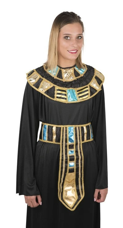 Ce col d’égyptien est en satin noir avec deux bandes ornées de détails dorés et bleus brillant.