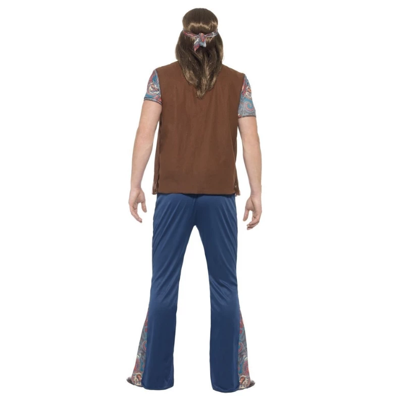 Ce costume Hippie homme se compose d’un gilet marron et d’un tee-shirt bleu à détails rouges et blancs, les deux en une seule pièce, d’un pantalon bleu foncé pattes d’eph avec des fentes sur le bas qui laissent apercevoir les mêmes détails que sur le tee-shirt, d’un collier peace and love et d’un bandana orné des mêmes détails que sur le tee-shirt.