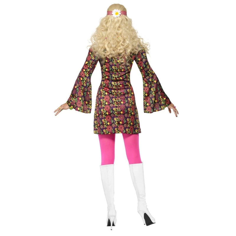 Cet ensemble Hippie des 60’s se compose d’une tunique noire avec des peace and love et des fleurs multicolores avec les manches évasées. (Ne contient pas les bottes, les collants, la perruque, le bandana et le médaillon.)