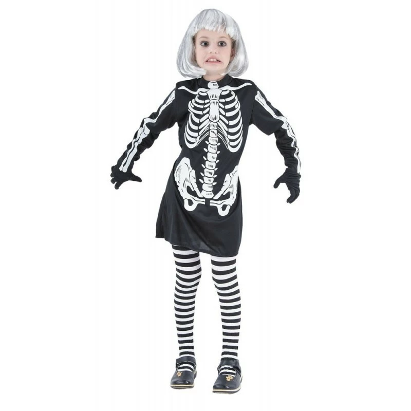 Le déguisement se compose d’une robe motif squelette, et d’une paire de collant à rayure (accessoire non inclus).