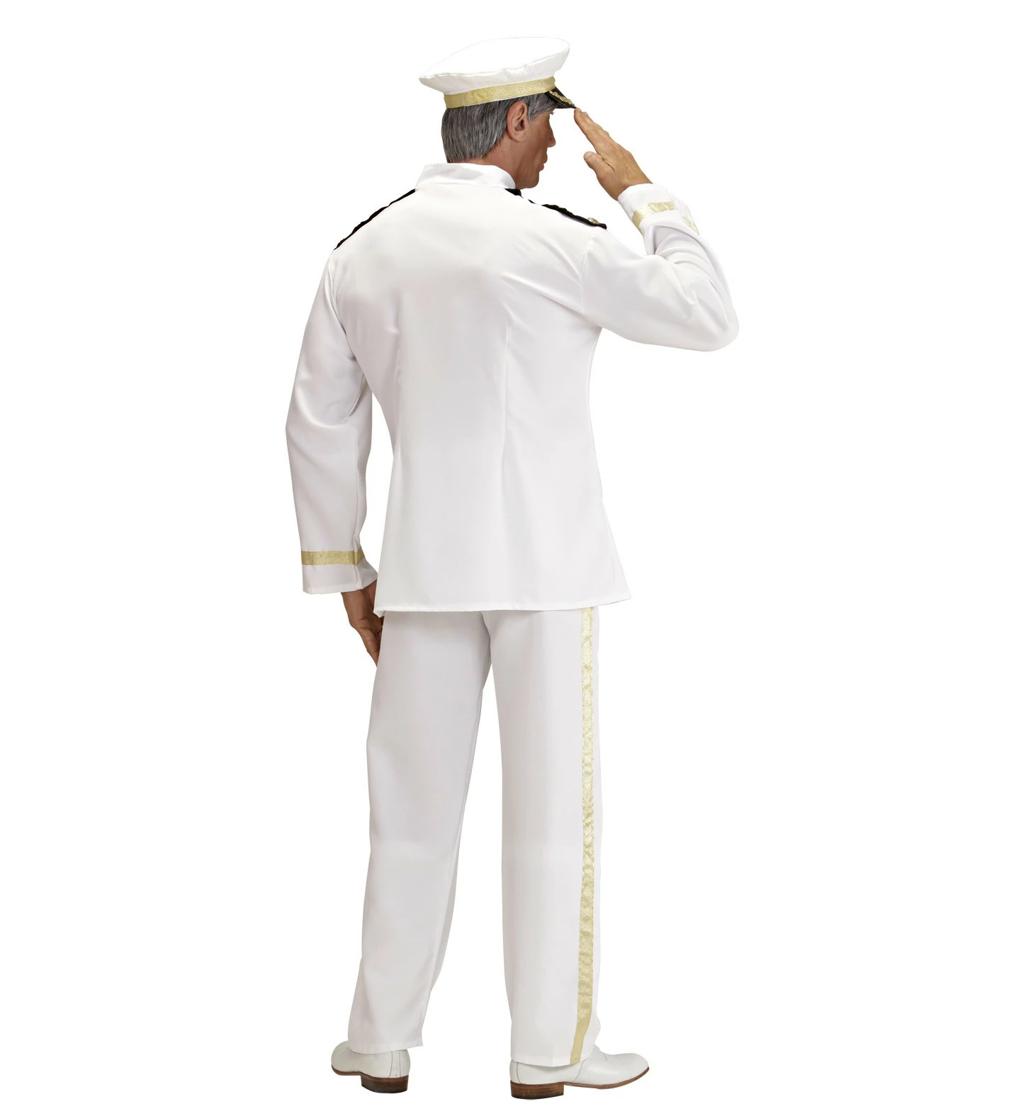 Costume capitaine marine homme, avec une veste blanche, un pantalon blanc, et une casquette.