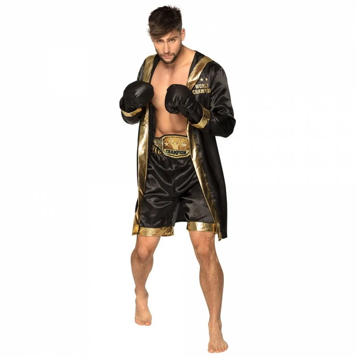 Le déguisement se compose d’un long manteau, d’une ceinture de champion, d’un short et bien évidemment d’une paire de gant.