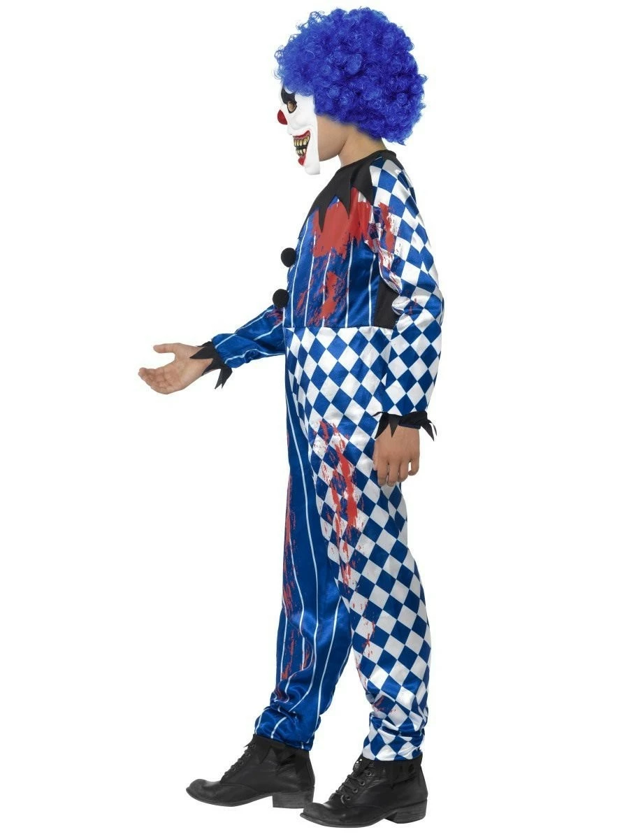 Costume de clown bleu composé d’une combinaison et d’un masque avec cheveux.