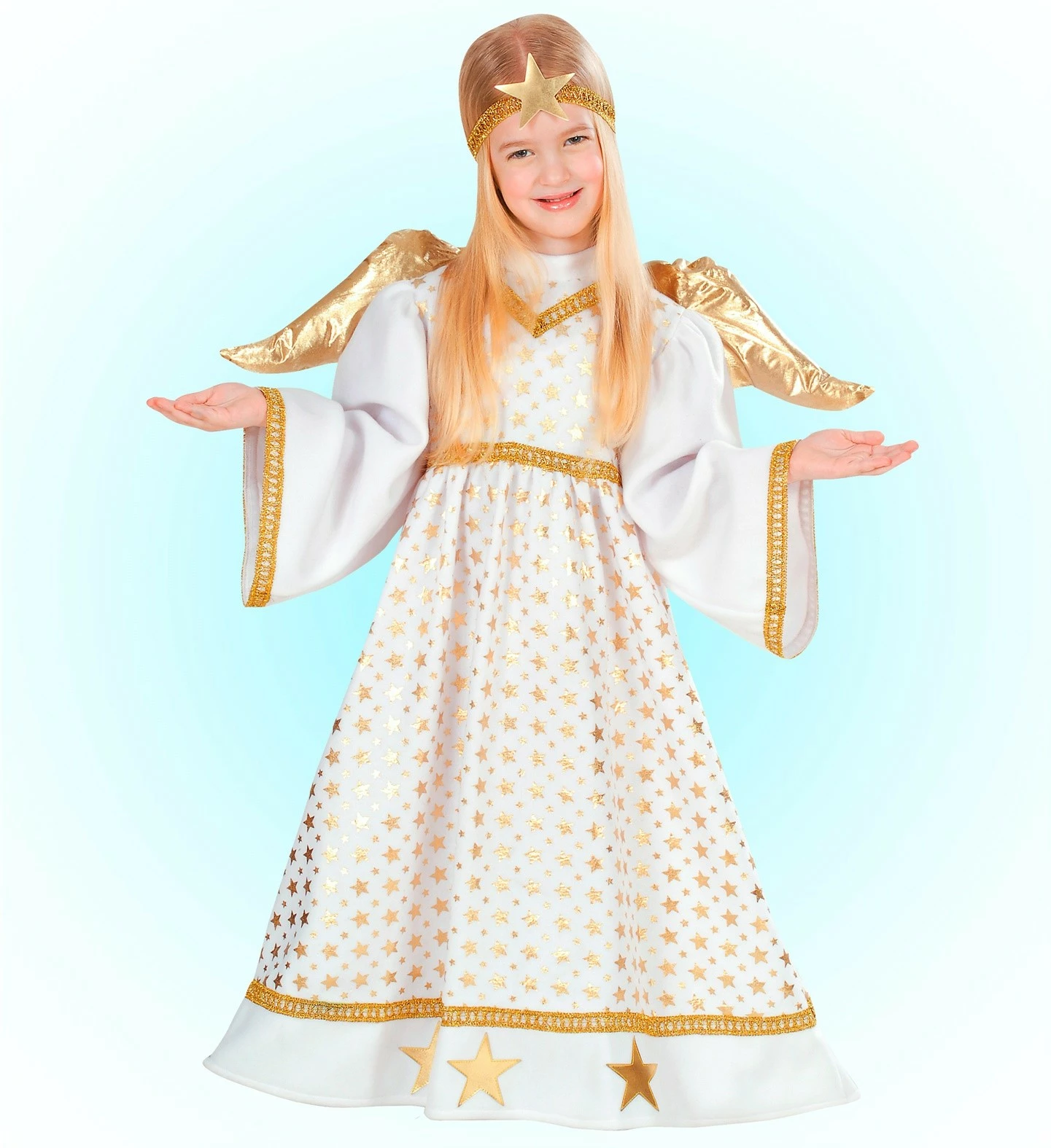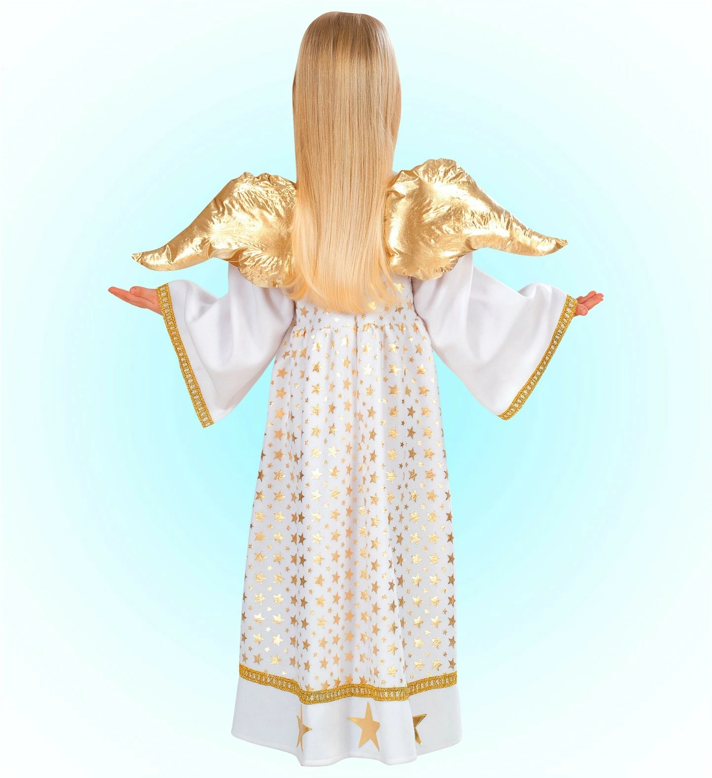 Cet ensemble se compose d’une longue robe blanche décorée d’étoiles et de bandes dorées, d’ailes dorées et d’un bandeau de la même couleur avec une étoile au centre.