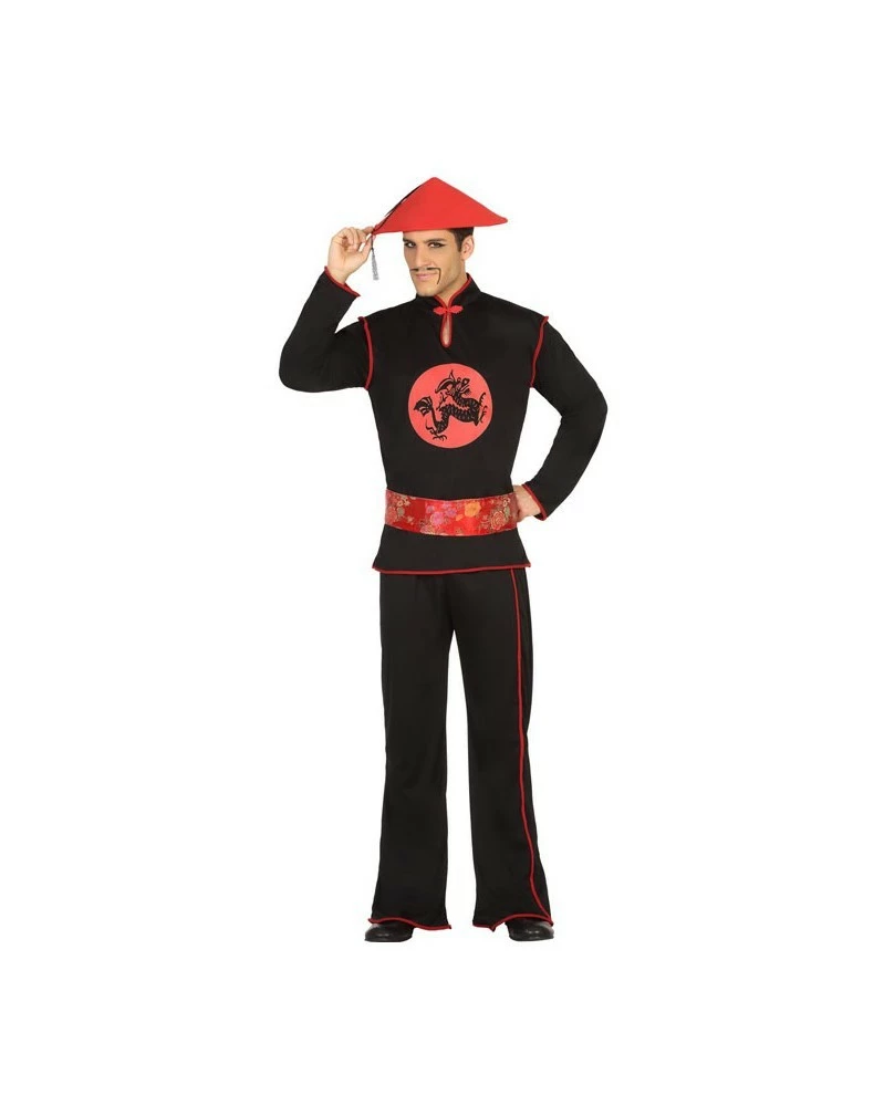 Cet ensemble se compose d’un haut noir orné de liseret rouge avec un dragon en son centre ainsi qu’une ceinture rouge à motifs florales sur la taille, d’un pantalon noir et d’un chapeau pointue rouge.