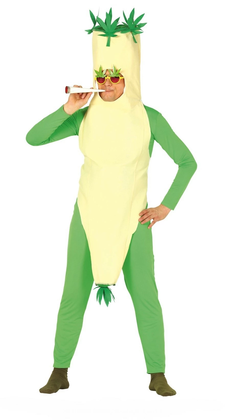 Cette combinaison forme de joint est beige décorée de feuilles de cannabis sur le haut et sur le bas. (Ne contient pas les lunettes, le joint, le teeshirt et le pantalon).