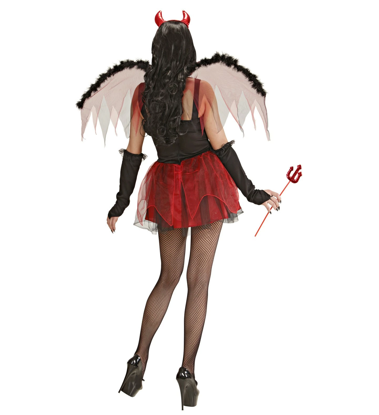 Le déguisement se compose d’une robe courte avec tulle, et corset sur le devant, d’ailes, de manchettes et de cornes en serre-tête .