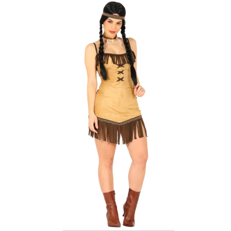 Le déguisement d’indienne se compose d’une robe en daim marron clair avec des franges, et d’un bandeau.