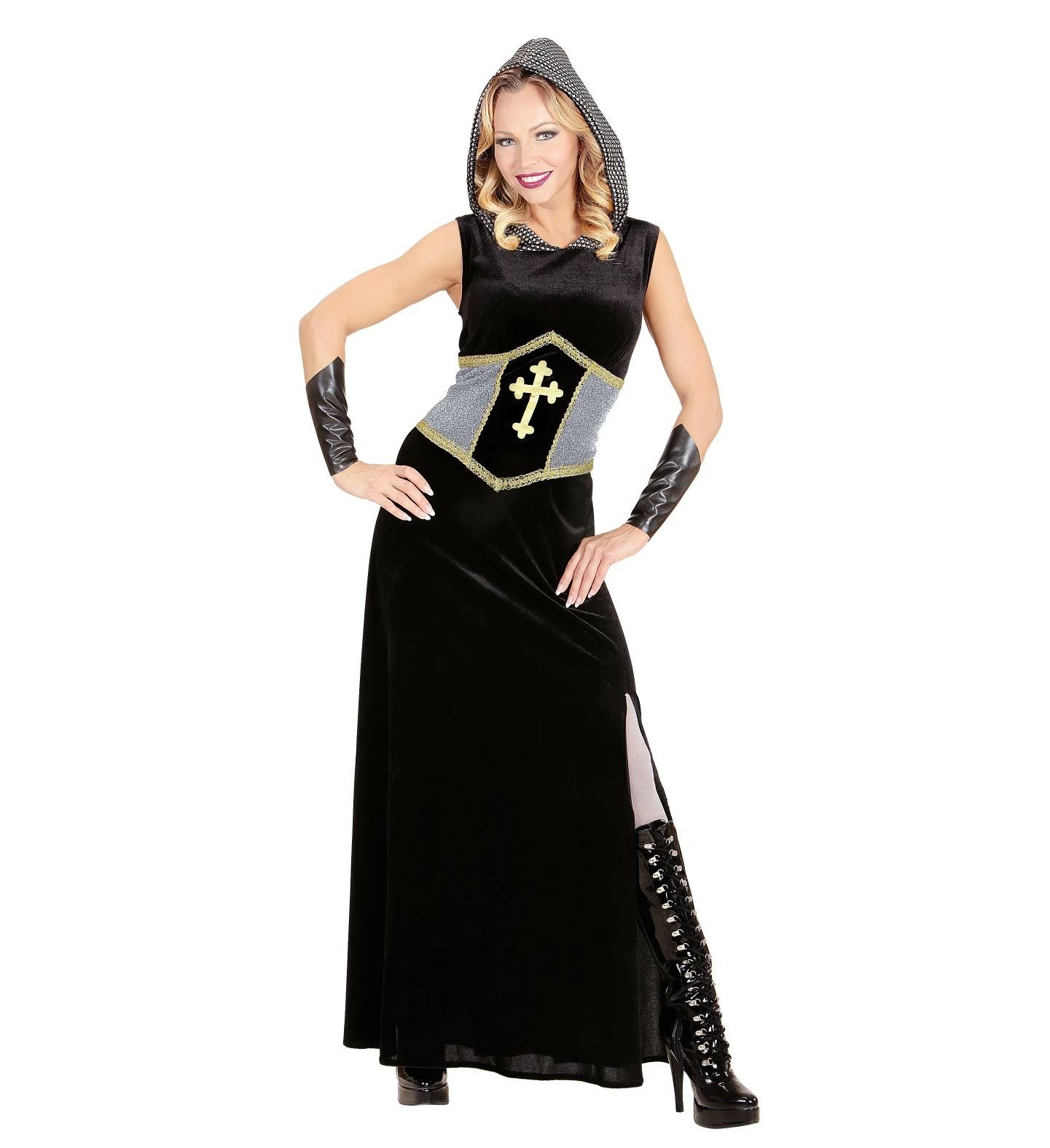 Jolie robe médiévale en velours noire et argent à capuche, avec des manchettes.
