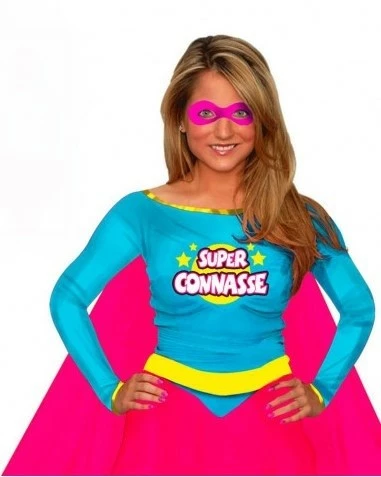 Cet ensemble se compose d’une robe à manches longues bleue sur le haut et rose sur la jupe, d’une ceinture jaune, d’une jupe rose, d’une cape et d’un masque tous deux roses.