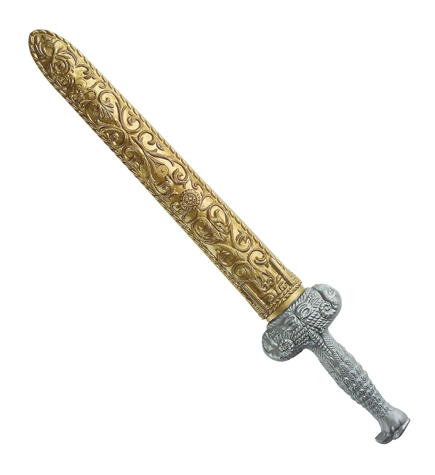 Epée en plastique de couleur argent avec un étui doré avec gravures.