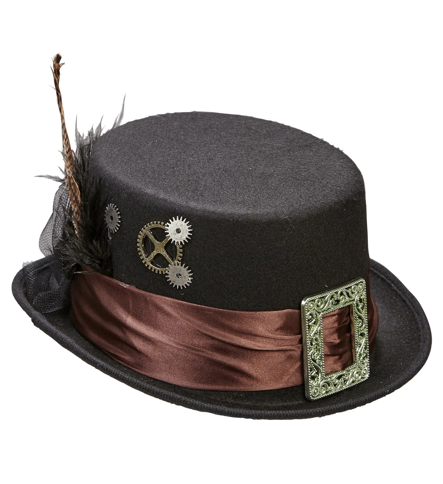 Chapeau en feutrine de couleur marron avec une ceinture devant de couleur marron et or. Derrière le chapeau se trouve une plume.