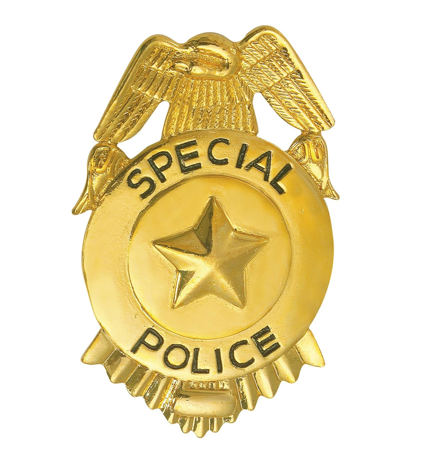 Cette plaque de policier est en métal doré orné d’un aigle sur le haut et une inscription « Police » sur le bas.