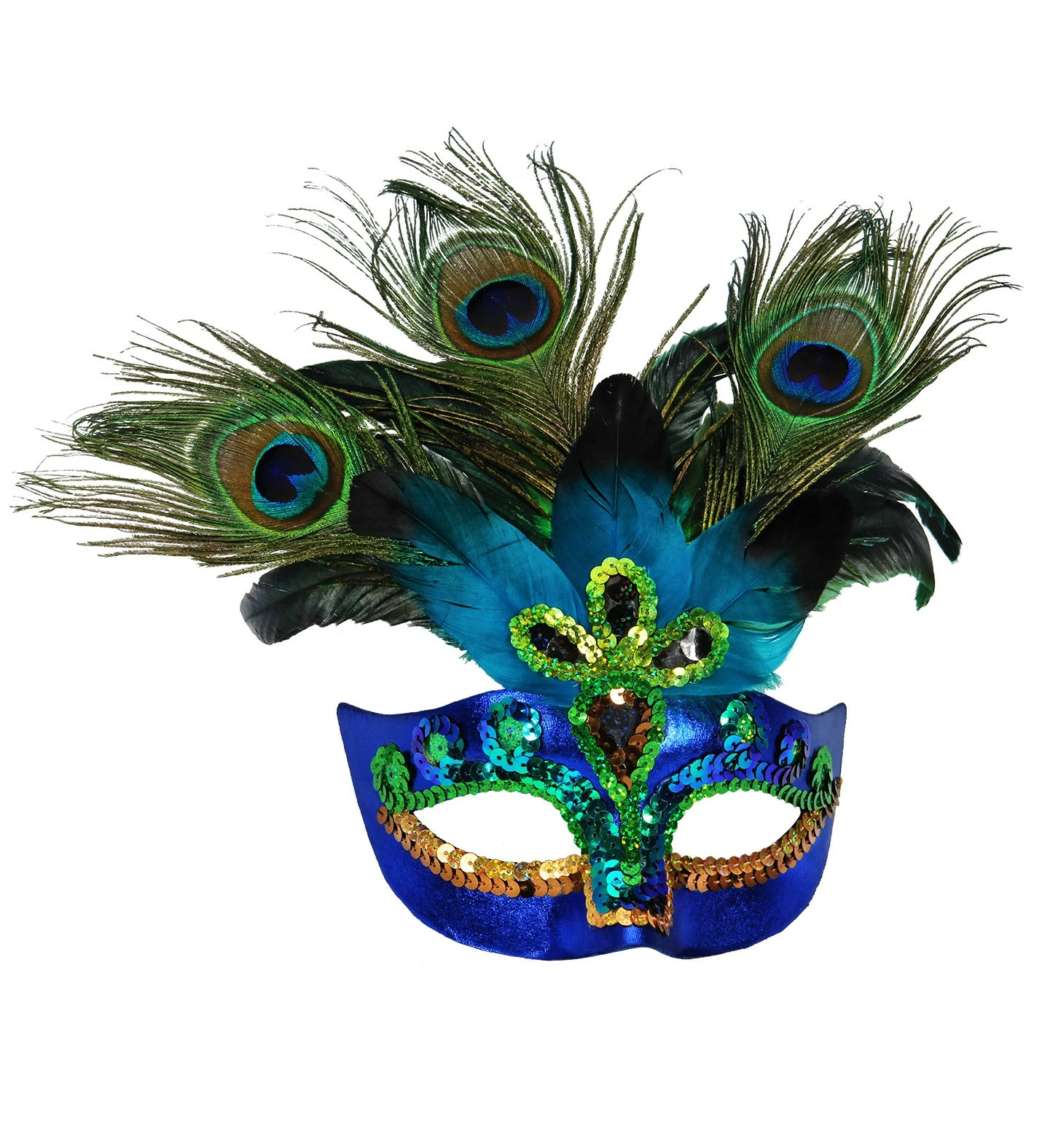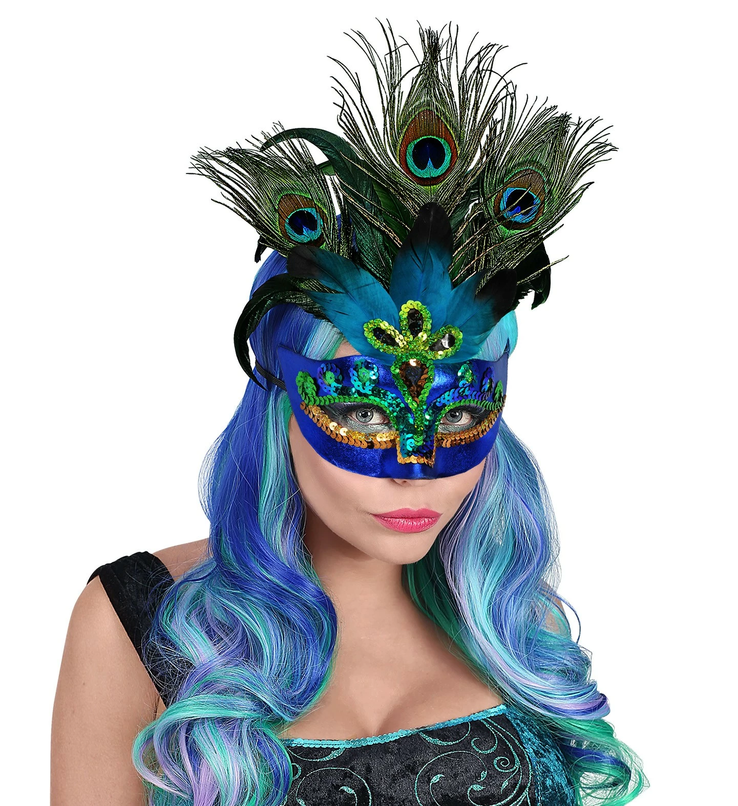 Ce loup bleu nuit satiné est décoré de sequins verts et marrons autour des yeux et de grandes plumes de paon au centre.