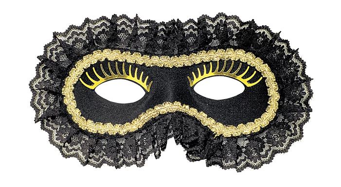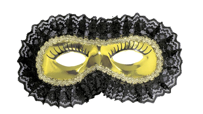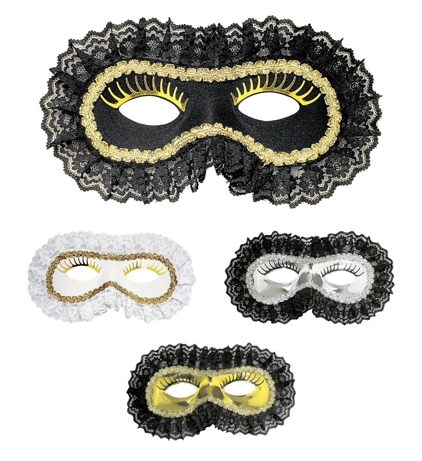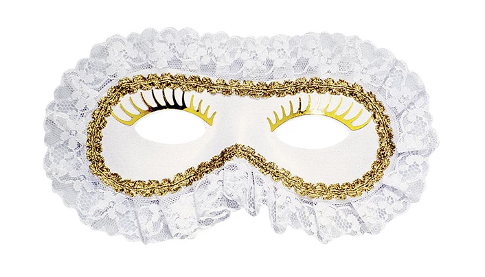 Ce loup argenté, doré, noir ou blanc est orné de détails en dentelle noire ou blanche sur les extrémités et de faux cils au dessus des yeux noirs ou doré.
