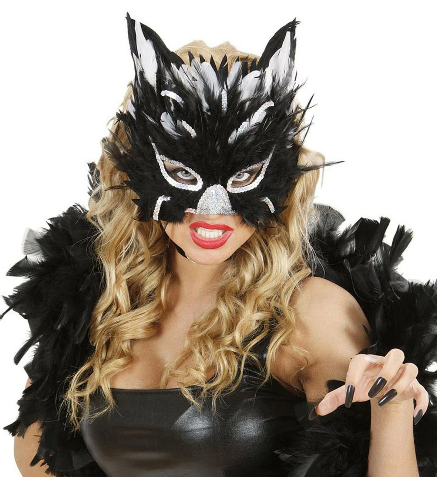Ce loup en forme de tête de chat est recouvert de plumes noires et blanches et orné de sequins argentés holographiques.