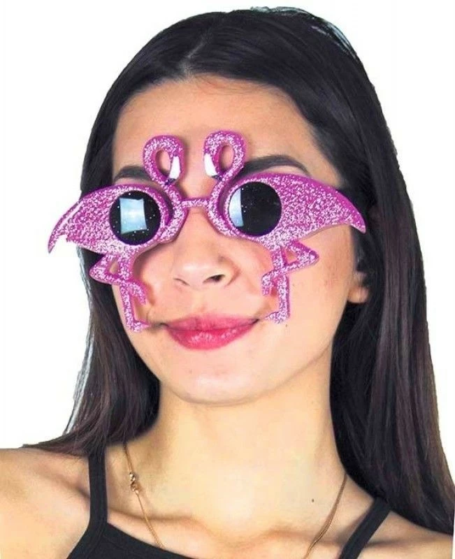 Ces lunettes roses à paillettes sont en forme de flamant rose avec des verres foncés. (Ces lunettes sont un accessoire de déguisement et non une protection solaire).