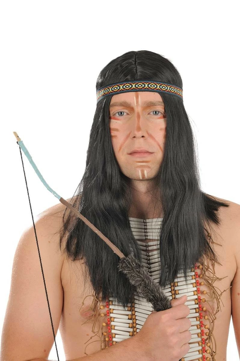 Cette perruque est composée d’une fausse chevelure mi-longue noire et raide ainsi que d’un bandeau à motif.