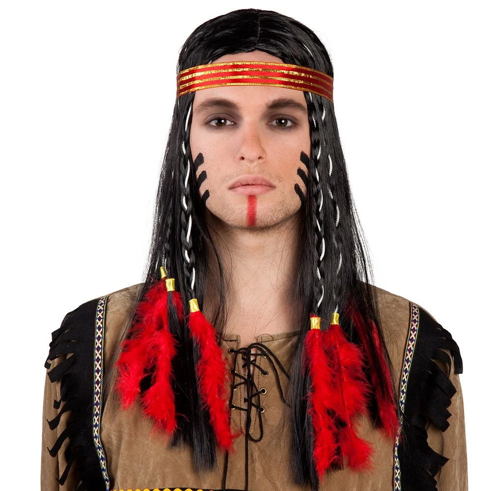 Cette perruque est noire et raide avec un bandeau rouge et argenté sur la base avec des plumes qui descendent en tresse de chaque côtés.