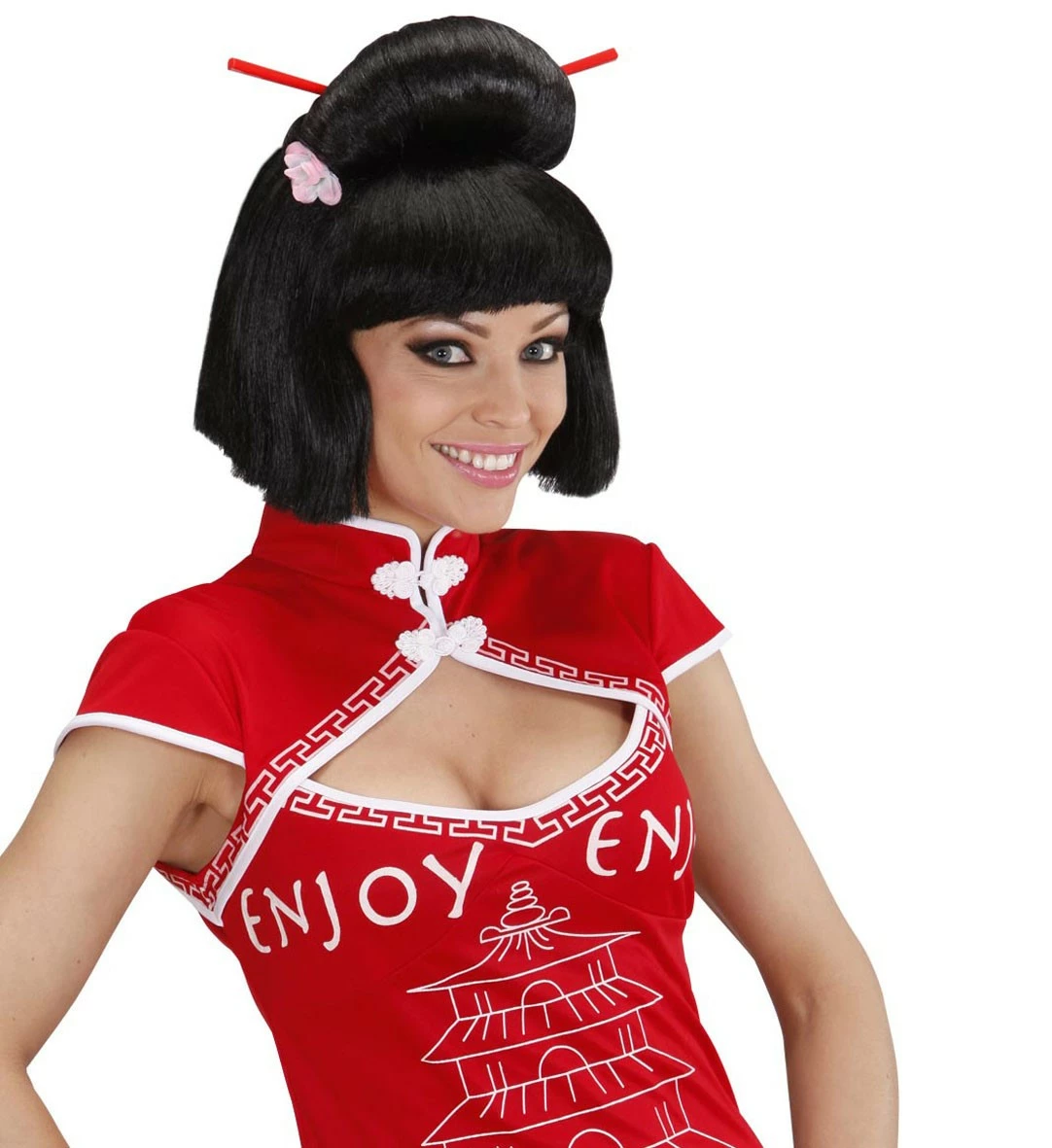 Cette perruque sera parfaite pour compléter votre déguisement de Geisha, elle a une coupe au carré avec une frange, accompagné de baguettes rouges et d’une fleur sur le coté.