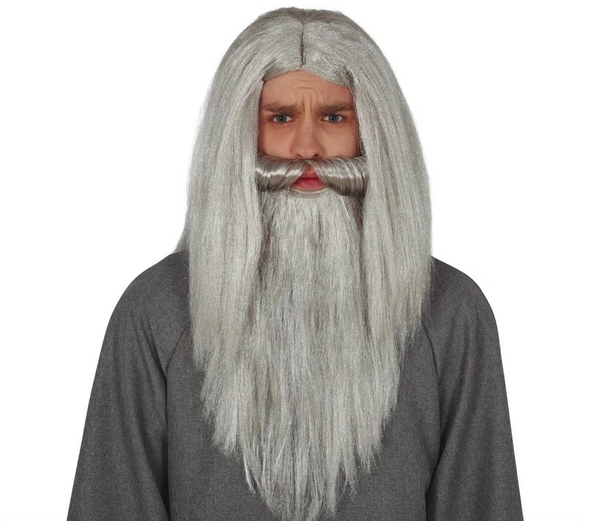 Cette perruque est grise avec de longs cheveux accompagnés d’une longue barbe et d’une super moustache, le tout est ultra réaliste !