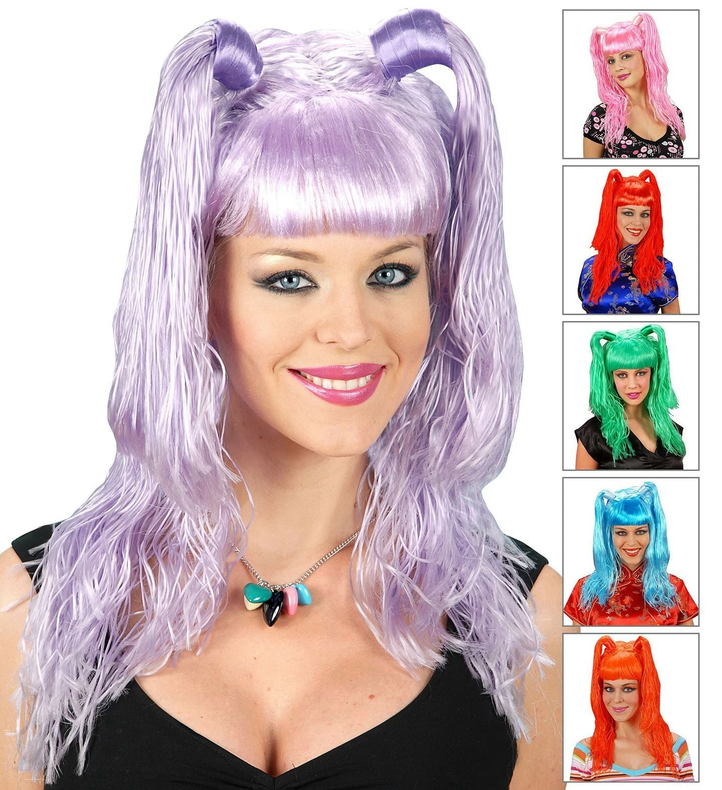 Cette jolie perruque à frange a des cheveux longs avec deux couettes sur le dessus.