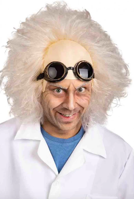 Perruque avec de longs cheveux blancs ébouriffés, sur le dessus du crâne se dresse des lunettes.