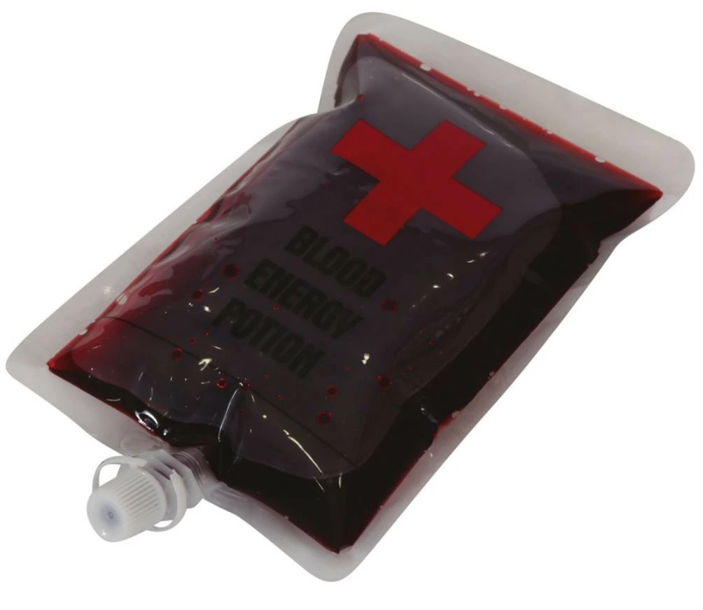 Poche de sang médical transparente avec tuyau, contenant 200ml de faux sang.