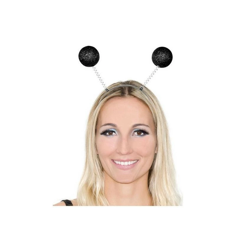 Ce serre-tête est noire avec deux ressorts décorés de boules noires pailletées.