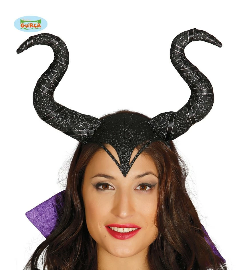Ce serre-tête est noir avec deux cornes décorées de paillettes et d’une petite coiffe qui se pose sur le front.