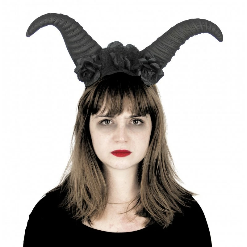 Serre-tête noir avec de grandes cornes et trois fleurs noir.