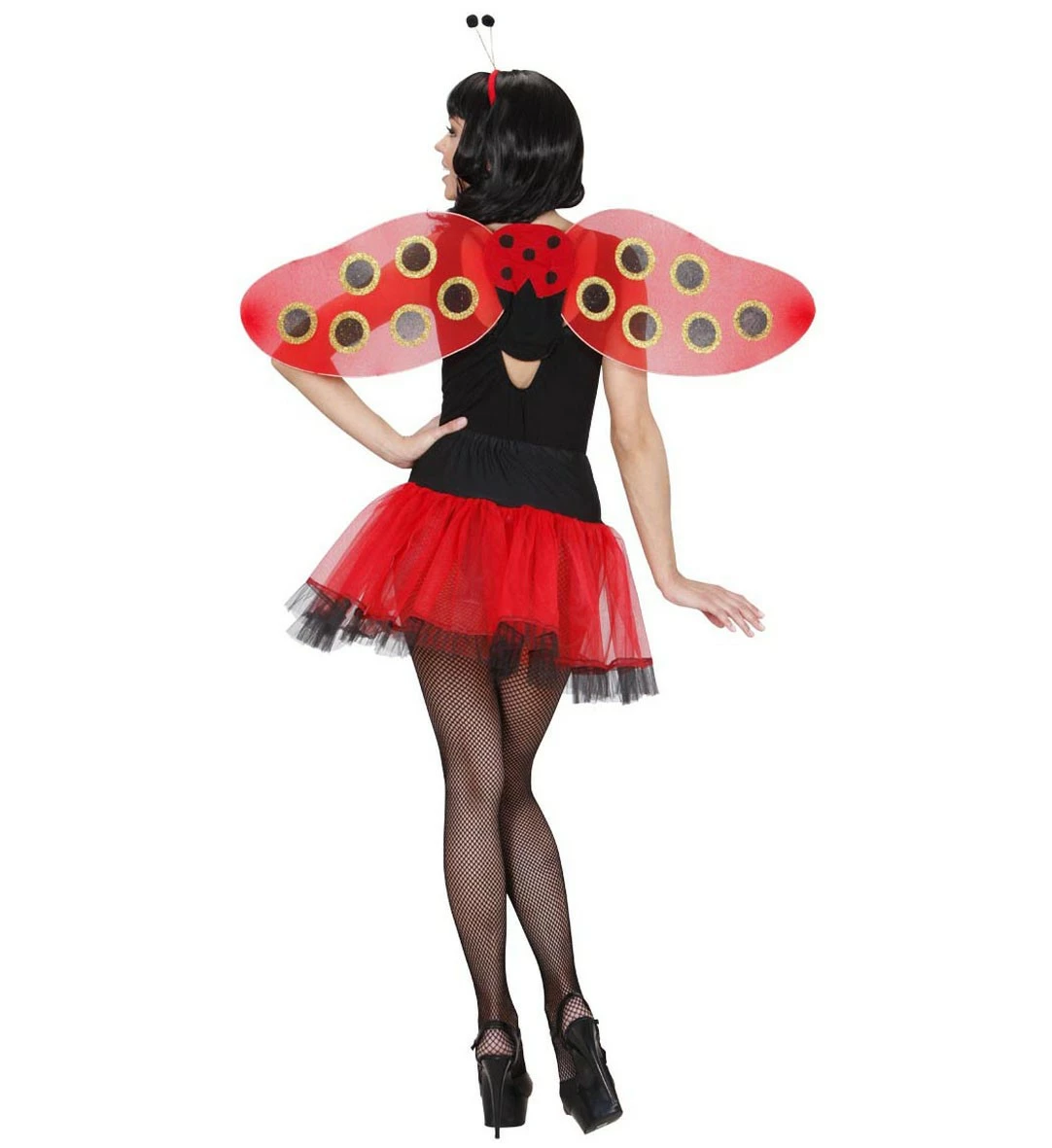Ce set contient une paire d’ailes rouges et noires décorées de paillettes dorées et d’un serre-tête avec les antennes.