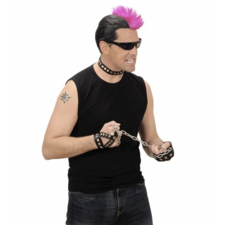 Ce set de bijoux de rocker sont les accessoires indispensables pour compléter un déguisement de rockeur ou de rockeuse. Ce set de bijoux est en simili cuire décorés de clous de couleur argenté composé d’un bracelet, d’un collier et d’une manchette.